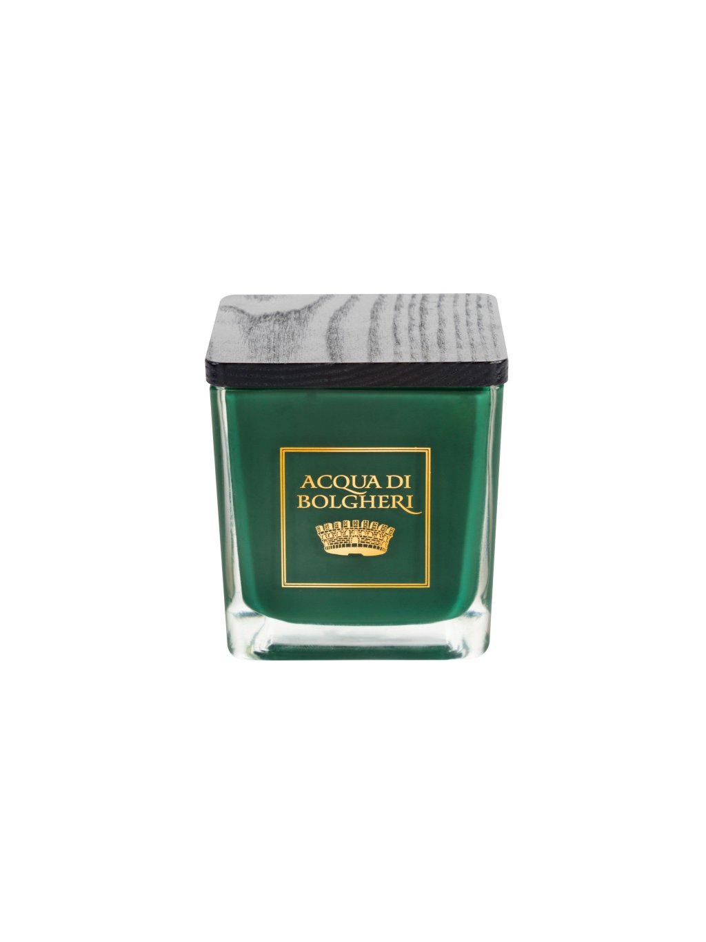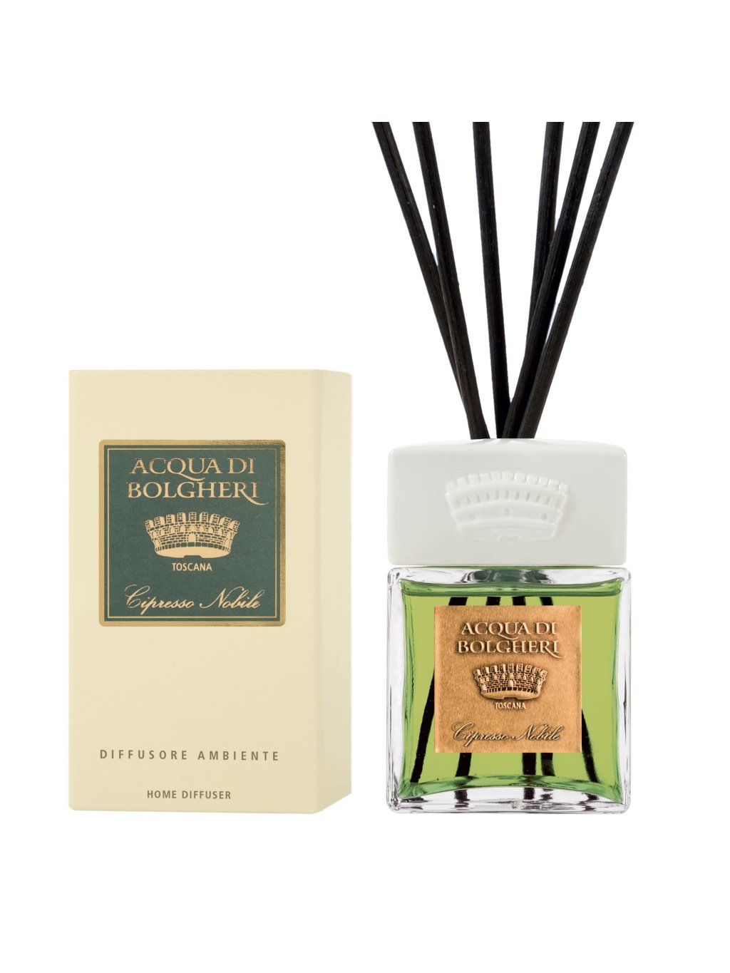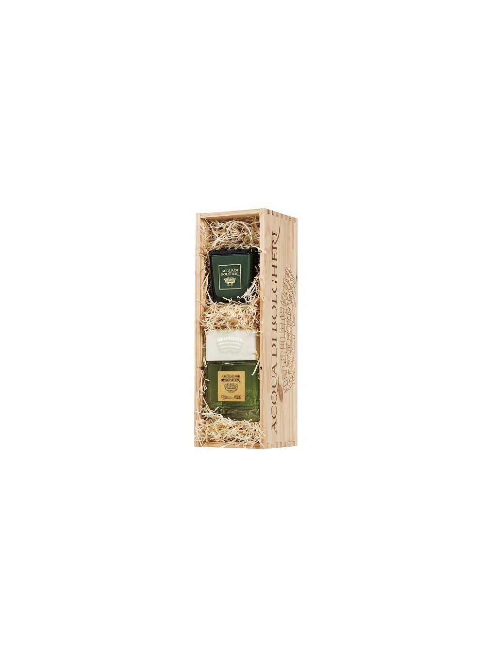 V dřevěné kazetě naleznete difuzér 200 ml a svíčku z 100% sojového vosku, v barevném skle s dřevěným knotem s vůní Acqua di Bolgheri Cipresso Nobile.
